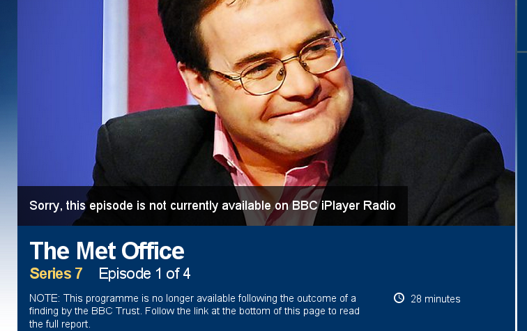 The BBC Trust has decreed that a light-hearted Radio 4 programme by Quentin Letts, “What’s the point of the Met Office”, which included a brief section suggesting that global warming might be a bit exaggerated, broke its guidelines on impartiality. See the verdict here, Quentin Letts’s piece here and commentary from Biased BBC here. The programme has been removed from the BBC iPlayer.
