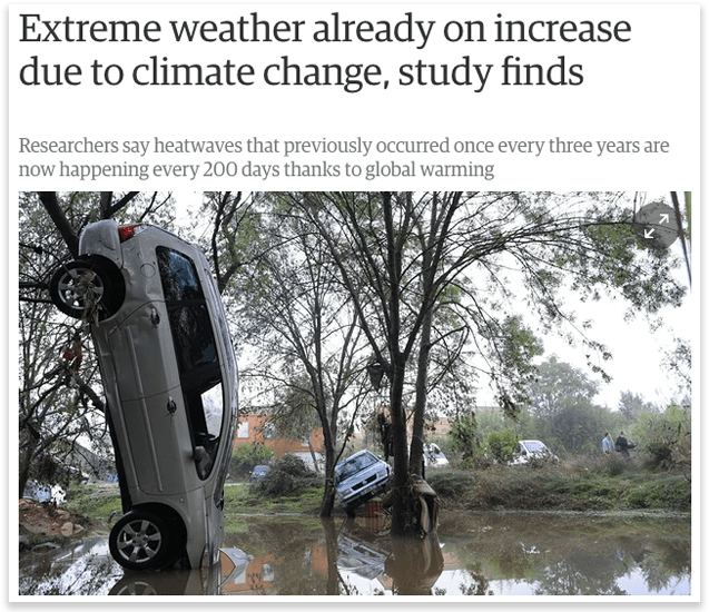 Headlines like the one above have all been helping to convey a message that extreme weather events are both increasing, and attributable to human intervention. Note the picture chosen to accompany the article!