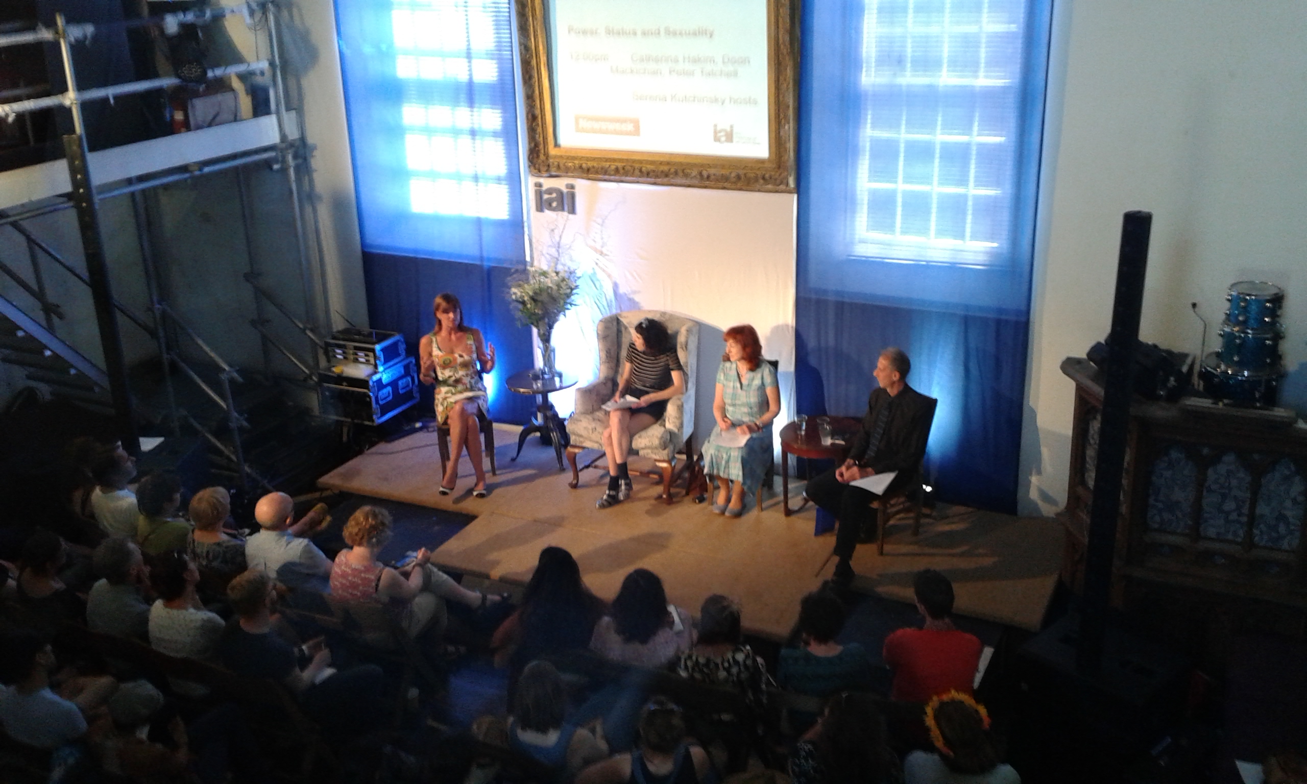 Perhaps the best example of a speaker destroying the assumptions of the audience. Catherine Hakim speaks about ‘erotic capital’, the observable fact that people with good social skills combined with pleasing appearance do better in the job market than those who ignore looks and personal presentation.(Also, obviously, that accidentally good looking people do very well too.) Hakim’s five minute opener was met with a great, silent audience sulk – not even polite applause to cap the end of her bit, until I started clapping 1.5 seconds into the silence. What was funny about this session was the fact that Doon Mackichan (of The Day Today and Smack The Pony fame) pictured far left, argued the uncontroversial line that feminism recognises inner qualities and that paying attention to looks is a patriarchal trap and got significantly more applause than Hakim, pictured to the left of Peter Tatchell. This was funny because the 15% more applause she got is the same percentage advantage enjoyed by Hakim’s beautiful people, and do you notice anything? The looking very good for her age Doon is wearing a summer dress exposing attractive, honeyed limbs whereas the older Hakim is necessarily more conservatively dressed with less flesh on show. What a loser (or winner, depending on how you look at it).