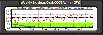 Here, courtesy of Gridwatch, is an illustration of how effective wind power has been over the last week. You may not be able to make out the line for wind power. It’s the blue one, that frequently disappears from view as it merges with the zero line: