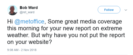 At some stage it did emerge, hidden away in an obscure link on the Met Office website. But despite this, the media somehow seemed to find the report very easily, and as usual, massively over-hyped its findings. So it looks as though the report was pushed out by the Met Office to the usual suspects in the media. Yet report author Mark McCarthy claims to be surprised that the report got so much coverage.