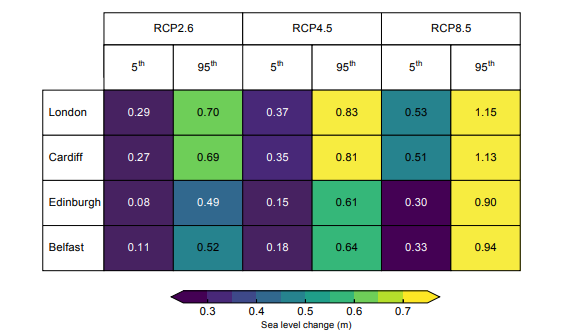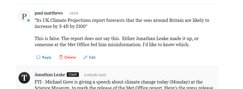 Taking a 5% chance of a one metre rise in sea level in London and Cardiff (but not Edinburgh or Belfast) under a wildly unlikely representative concentration pathway and transforming it to 3-4 feet suggests a deliberate effort to hide his source. And blocking you onTwitter is another thing to add to your complaint to the Times for grossly unethical behaviour.