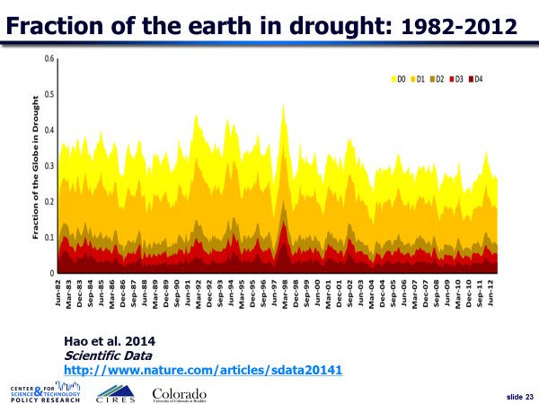 Here’s a graph from a paper in Nature showing the fraction of the earth suffering from drought over the last 30 years. The different colours show different drought intensities on a 5-point scale from “abnormally dry” (D0, yellow) to “exceptional drought” (D4, dark red). It shows little change; if anything, a slight decrease in drought: