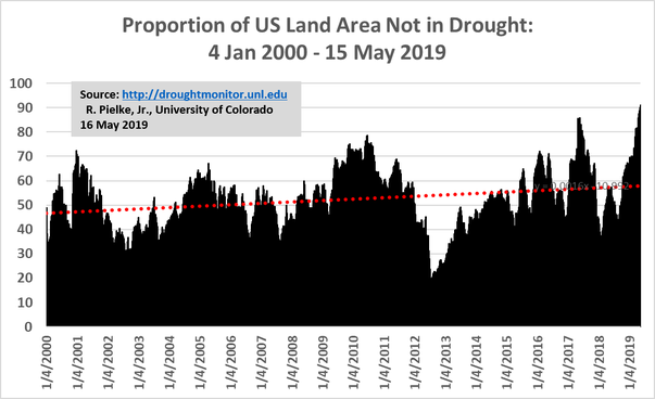 A recent post by Roger Pielke shows a graph of the area of the US suffering from drought since 2000, from the DroughtMonitor website: