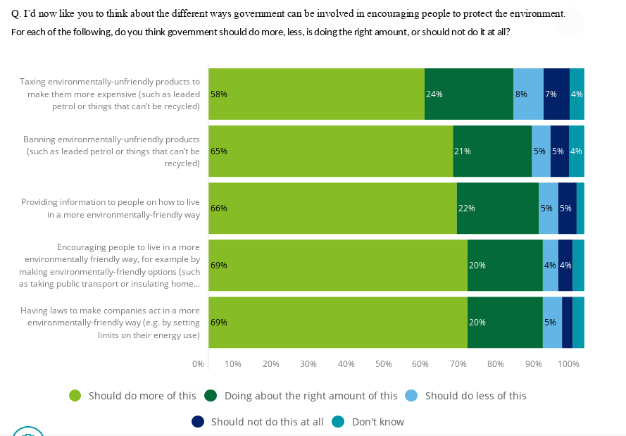 “Our survey also found remarkably strong public demand for action on climate change. We asked whether the government should press ahead with a range of measures to protect the environment and each measure was supported by at least 80 per cent of the public – as shown in the green elements of the chart. Some 65 per cent said that the government should be doing more to ban environmentally harmful products and 58 per cent want to see higher taxes on them.”