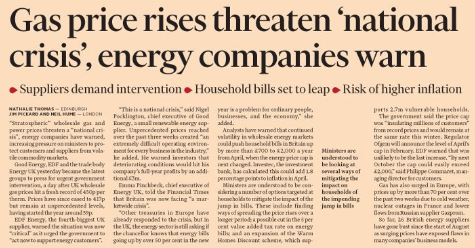 “Small businesses, which employ almost 13 million people in the UK, are expected to feel the brunt of crippling energy costs in the coming weeks as firms begin to strike new fixed-term deals amid record high energy market prices across Europe.