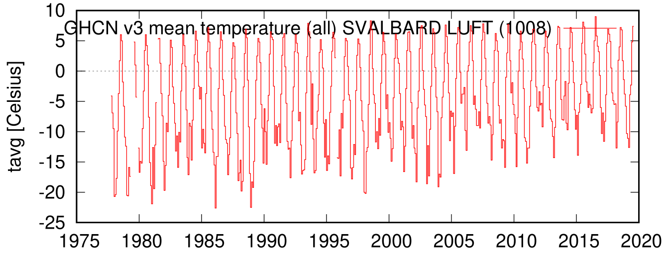 A final cogent point that our intrepid BBC reporters might have noted is that Svalbard lies in a place where warmth from the North Atlantic Drift meets the icy air descending from the Arctic. As we know, according to reports, Svalbard has warmed by 4 °C in recent years. But rationally, if this has occurred because of a shift in where warmth and cold meet and do battle, there seems little scope for further increase. The temperature increase is not due to the radiative effect of carbon dioxide alone, or else there wouldn’t be the noted excess here. Almost all the increase seems to have taken place during the winter, which I would be grateful about, if I was a resident there: