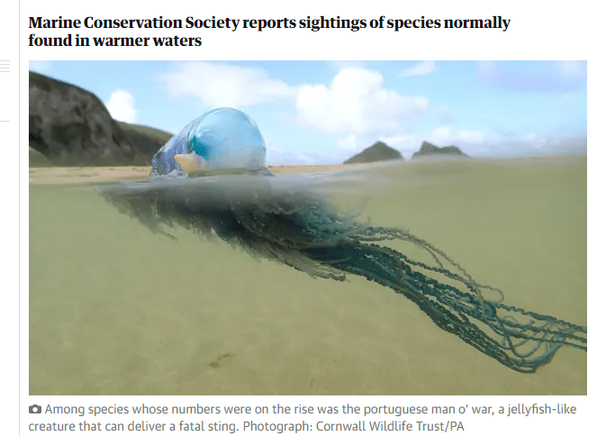 Even if the jelly fauna of the seas around the UK was changing, you would have to be an idiot to simply append “owing to climate breakdown” as a reason for it. What other reasons might there be for such changes, if they are real? You’d have to consider natural cycles and natural irregular irruptions. Pollution (eutrophication, not carbon dioxide). Um, what else? Oh yeh. Overfishing. But before you did that you’d have to make the case that your data proved that the fauna had changed. To do that you would not simply need an inventory of species. Instead you would have to control for effort and the locations that the effort was expended. Most public records of jellyfish are likely to be of washed-up specimens, I would have thought. This is not necessarily a good way to take a census.