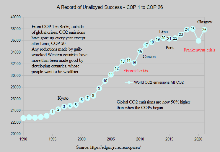 The figure shows the record of previous COPs in reducing global CO2 emissions: