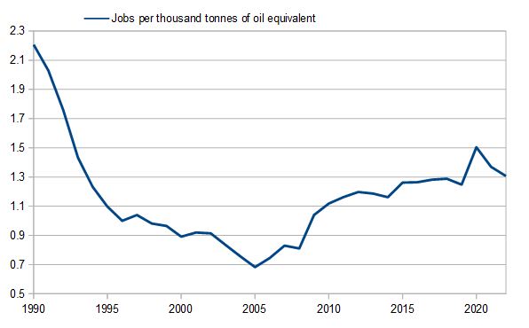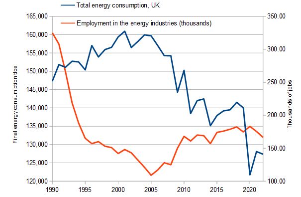 The number of jobs in energy declined from the 70s onwards (and probably since before then; the statistical release I have to hand begins in 1980 for jobs but only 1990 for energy). This reflects the loss of jobs in coal (and inasmuch as coal use switched to gas, reflects an improvement of productivity). Employment in energy reached a nadir in 2005 and then began to climb.