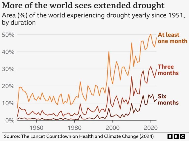 [The drought] indicator uses the Standardised Precipitation Evapotranspiration Index to monitor the intensity and length of droughts on all land areas. The total proportion of global land affected by extreme drought for at least 1 month per year increased from 15% in 1951–60 to 44% in 2013–24. In 2023, 48% of the global land area was affected by at least 1 month of extreme drought—the second-highest level since 1951 and only 2% less than the record in 2020.