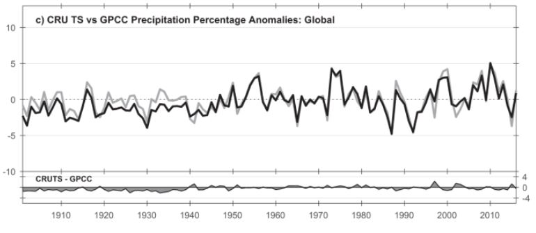We can, in looking at the basis for this index, make the bold guess that precipitation, P, has not changed over the past hundred years. It seems quite clear that the lion’s share of the change in the underlying formula comes from the change in ET0. The climatologist, in searching for an increasing drought, would not overlook “just” precipitation, if that had gone down. As if. Here’s CRU TS precipitation, up to 2017 (from Harris et al’s description of CRU TS V4):