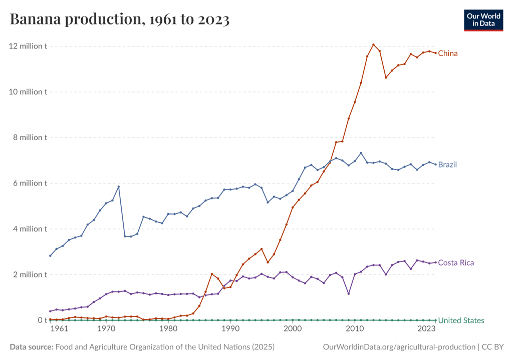 The problem is that they don’t produce any data to support the suggestion that climate change is adversely affecting banana crops in Guatemala now. Our World in Data shows a slight fall-off in the two years to 2023, but the graph basically shows massive growth in banana crops from its start date in 1961: