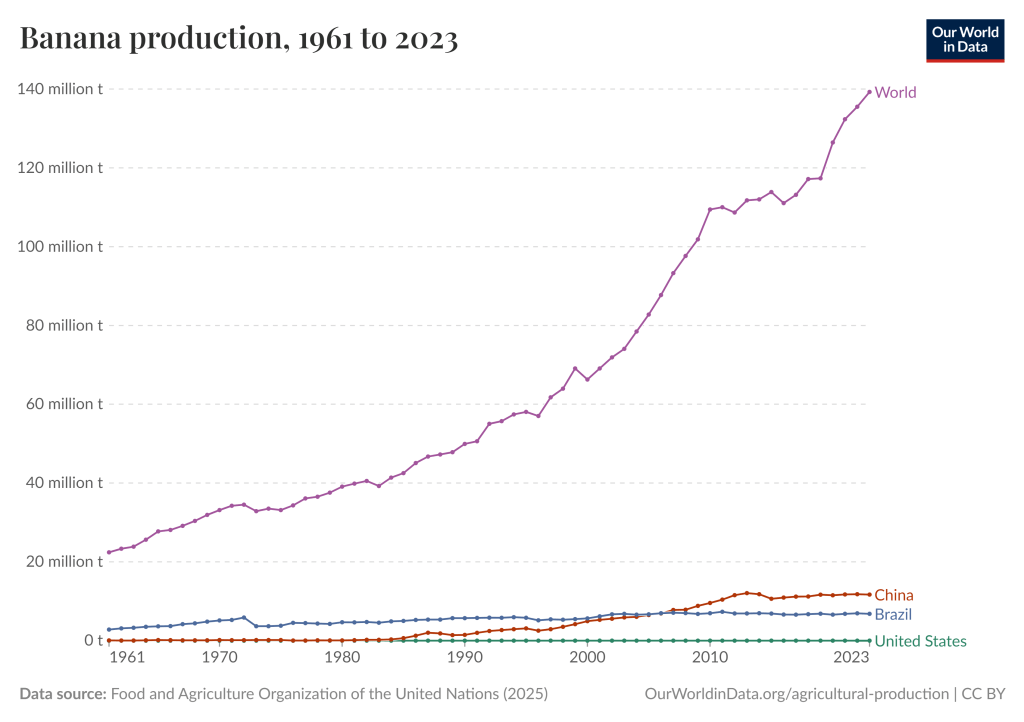 Note that the UN FAO has 1990 Bananas production of 45.14 mt and 2023 production of 123.95 mt. Our World in Data has 49.94 and 139.28. So both data sets flatly contradict Christian Aid’s claim.