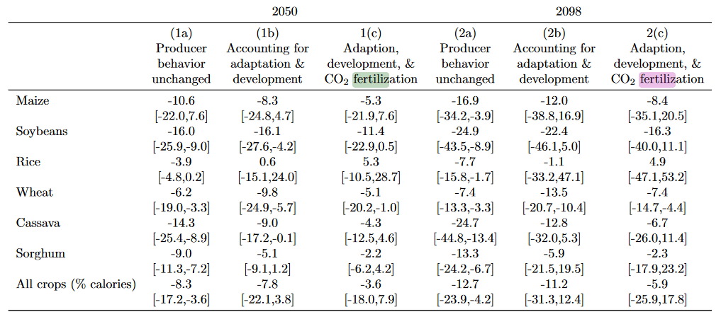 The 2100 concentration under RCP8.5 is 936 ppm, up from the baseline year (2015 for Hultgren et al) of 400 ppm. And the effect of CO2 fertilisation, they say, for that change (more than a doubling) is only +10%? I think this is low.