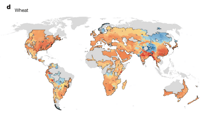 Several references to fertiliser of the non-gaseous kind, then a mention in Figure 2’s legend. The figure is the first showing results. Its title is: Projected end-of-century change in crop yields resulting from climate change, accounting for adaptation to climate and increasing incomes. [I’m only showing the wheat panel here. Looks bad for the U.S., huh? But at least we can grow wheat in Mongolia, and on the north coast of Norway….]