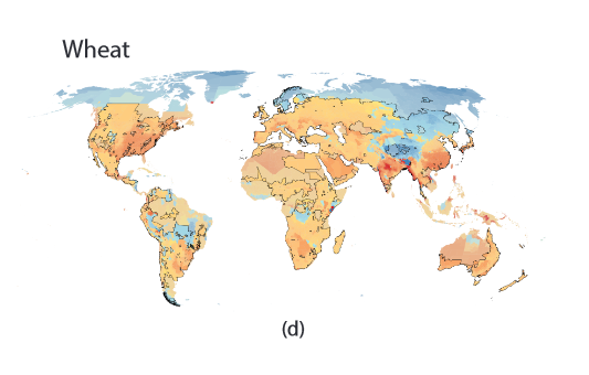 [Same key as above.] Thankfully, under the realistic scenario we can grow wheat on the Himalayas, Svalbard, and Kaffeklubben Island off the north coast of Greenland. [Snipped from Supplementary Figure S.14, p.71 of the S.I.]
