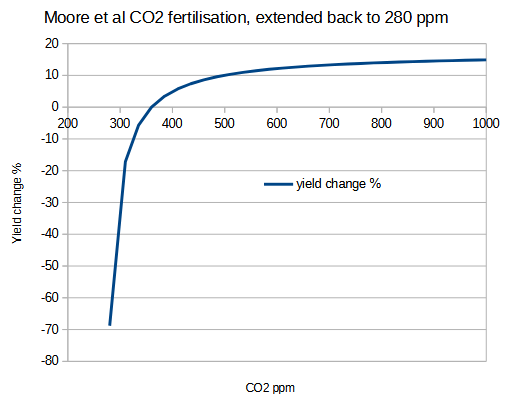 The baseline CO2 is 360 ppm, which is not “pre-industrial,” usually given as 280 ppm. The result is that at 360 ppm the change in yield is 0, by definition. The parameters used mean that half of the CO2 fertilisation for C3 plants occurs in the first 100 ppm (from 360 to 460 ppm) and rapidly tails off thereafter. Starting at 360 ppm is mad, because if you trace the curve back to 280 ppm, you end up with a yield of about -70% of the “modern” baseline of 360 ppm. In other words, if this figure represented reality, everything was dead in the pre-industrial era. Here’s my emulation of their figure for C3 plants, but going back to 280 ppm.