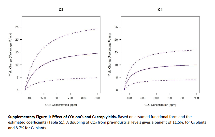 We know that CO2 is plant food, although the alarmists hate the idea with zeal. It’s easier to photosynthesise when there is more CO2, and that is not a controversial statement. It’s also non-controversial that C3 plants like wheat and rice will benefit more from CO2 enrichment than C4 plants like corn. [C4 plants can be thought of as plants that have evolved to eke out a living in a world where the food supply – CO2 – has dwindled over aeons until plants are half-starved.] The authors’ treatment of CO2 fertilisation is described on p.69 of the S.I.: does it pass the fairness test? Or did they pick a fertilisation model that downplays the likely effect?