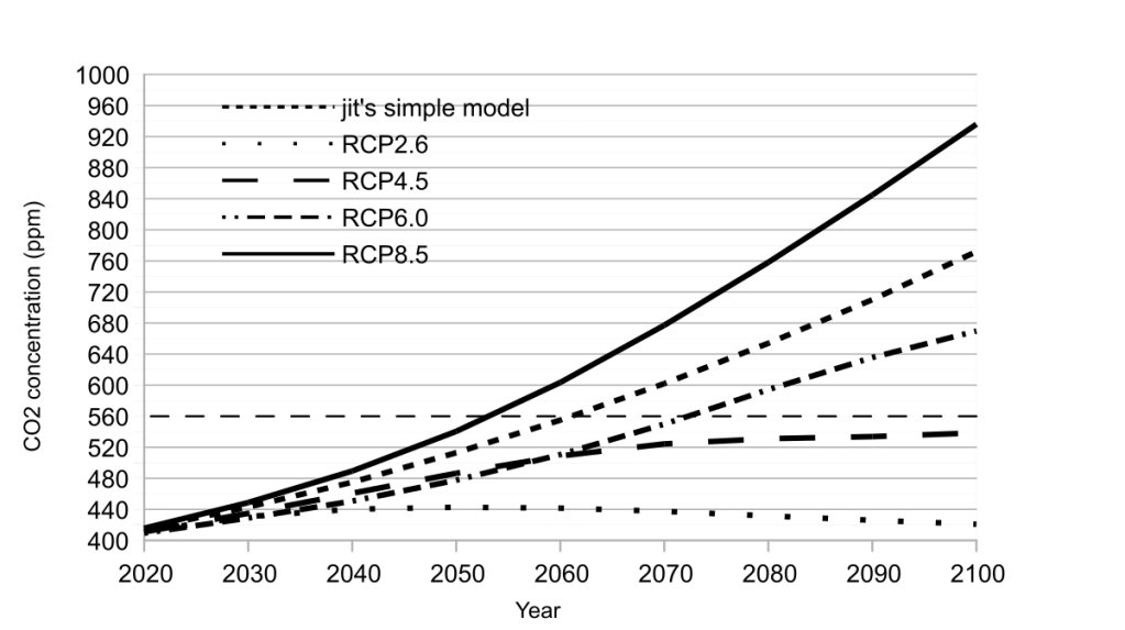 This figure shows the CO2 concentration in 2100 under the RCP8.5 scenario (Figure reproduced from Denierland, data from climatechange2013.org (AR5). [Ignore “jit’s simple model”; one of these days, I’ll check to see how it is doing prediction-wise.]