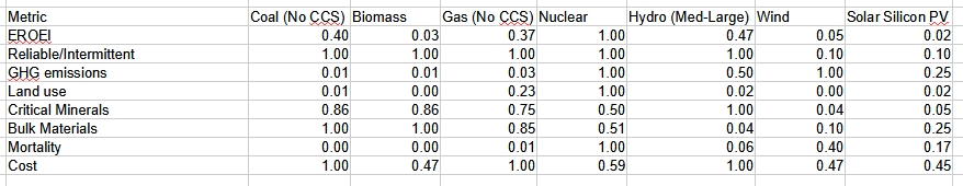 Anyway, I was easily deterred, but resolved to come back to the issue, but never did. Until today. David Turver has recently posted “Physics First Energy Policy” on the Eigen Values Substack, and included in that assessment is a table of data for eight different properties of electrical generators. I copied the numbers, I hope faithfully, into a spreadsheet:
