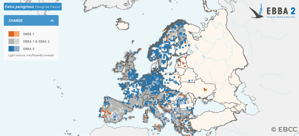Here’s the EBBA 2 (European Breeding Bird Atlas) map of the peregrine’s present range in Europe: