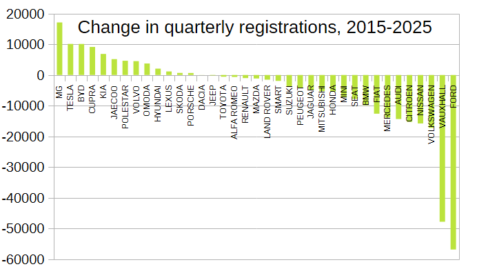The biggest winner is MG, selling 17k more in a quarter than ten years ago. The biggest loser is Ford, selling 57k fewer in a quarter than a decade ago.