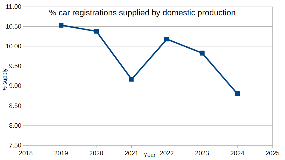 This figure shows UK car production, for the domestic market, as a percentage of overall registrations, averaged for the year as a whole. In 2019, domestic production was 10.5% of registrations; in 2024, 8.8%. This year (first six months only) it is 8.4%. [It isn’t. The “SA” means “seasonally-adjusted” by the boffins at ONS. Nevertheless, this is their smoothed number.]