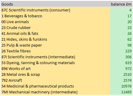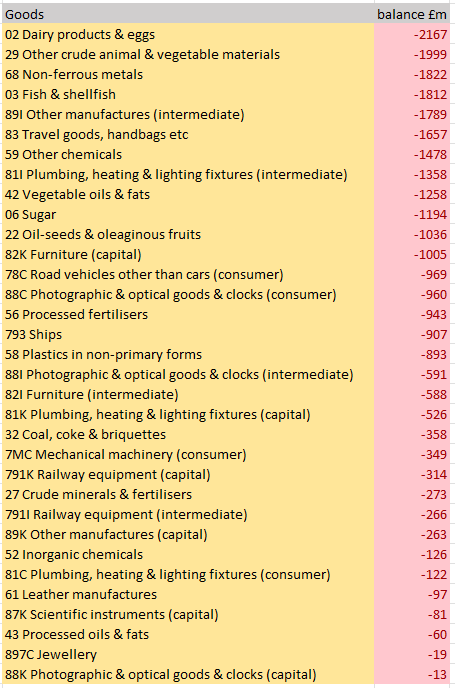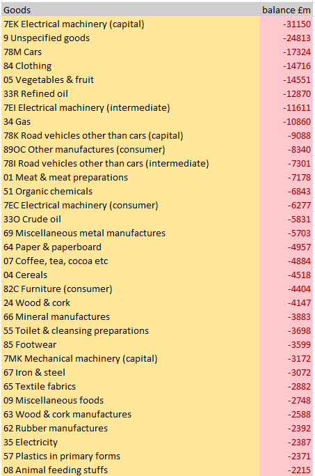Anyway, before I tell you what we have too much of, let me first tell you what we have too little of. Now, there are numerous caveats to this data. It only deals with goods, and while we know we have a deficit in goods, we have a surplus in services. So this table may make things look worse than they really are. And yes, describing exports as things we have too much of is flippant and not really what is going on. But bear with me. The data are in ascending order of 2025 trade balance, so the goods we have the worst balance on are at the top.