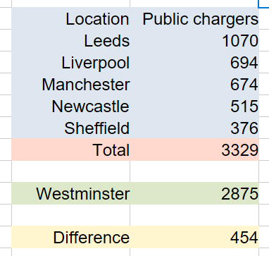 The context that there is currently one charger for every 16 EVs – plenty, one might think – was not provided. We need, said Ms Buckley, “visibility of chargers” because her survey said that half of all non-EV drivers did not have confidence in the charging infrastructure. There was a “postcode lottery” when it came to charging. Then she wheeled out her killer stat: that there were more chargers in Westminster, than in Leeds, Liverpool, Manchester, Newcastle and Sheffield combined!